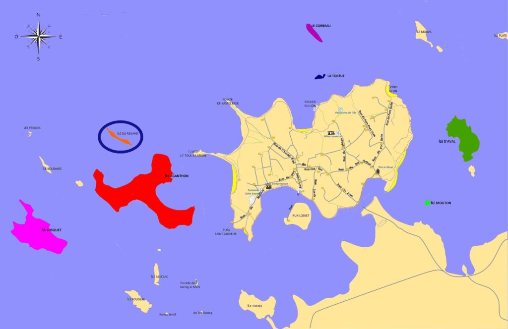 Dans une île de la côte, l’île “Agathon” ou à “Canton”, a existé naguère un sanctuaire de Saint André (en breton Andréo) dont il reste encore quelques vestiges ; on y va en pélerinage pour la guérison de la coqueluche parce que le mot coqueluche :”dréo” précédé de l’article “ann” fait “ann dréo” qui se prononce comme le nom du saint.
